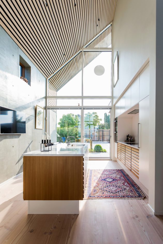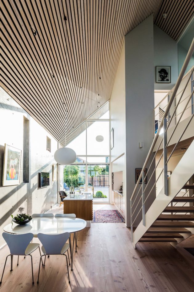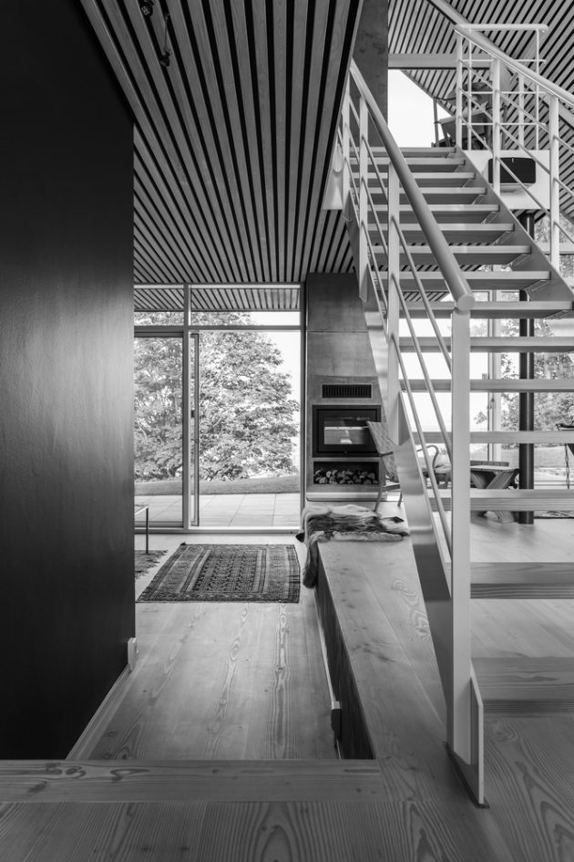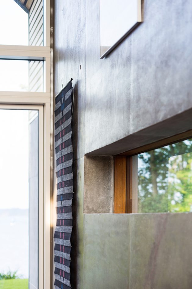 True to Nordic principles, the house employs a minimal, enduring palette—wood, slate, zinc, and concrete. Vertical and horizontal timber strips warm the façades while dark slate cladding grounds the building and endures the maritime climate. Zinc trims articulate junctions and edges, developing a graceful patina over time. Exposed concrete walls slide from exterior to interior, reinforcing a seamless transition between landscape and shelter.