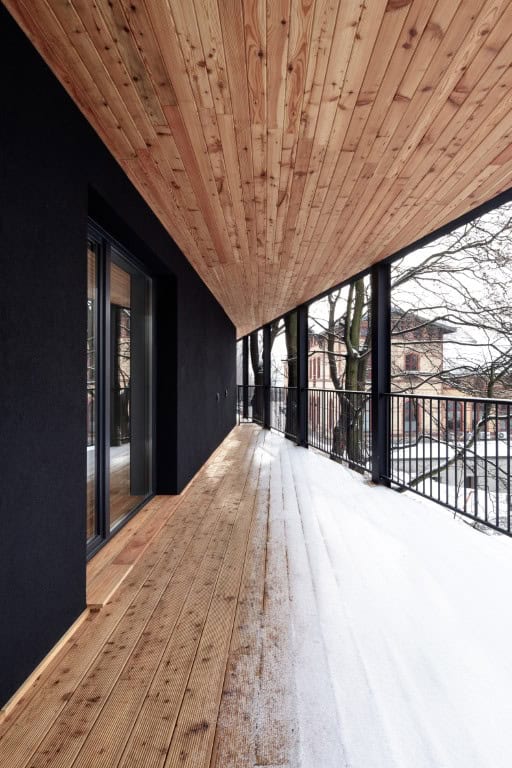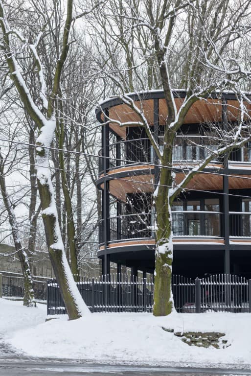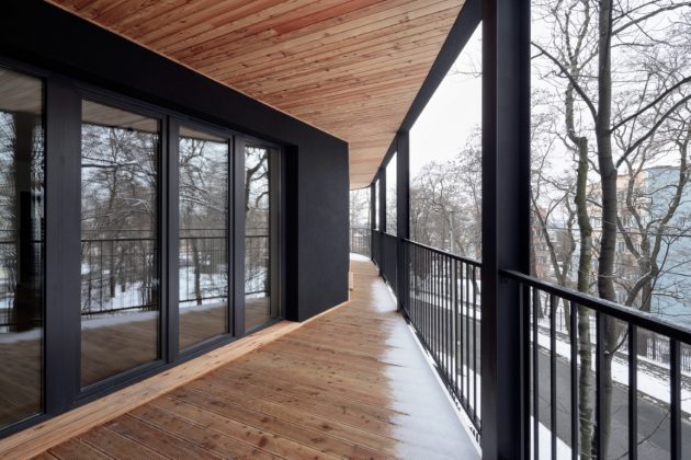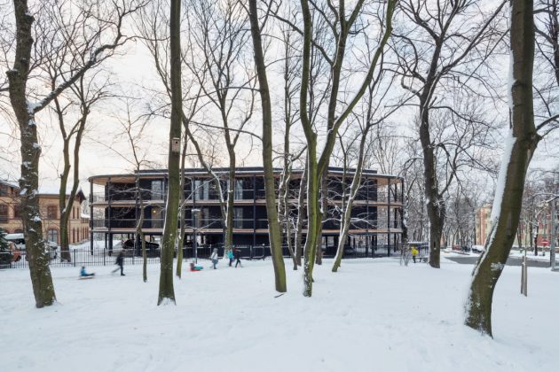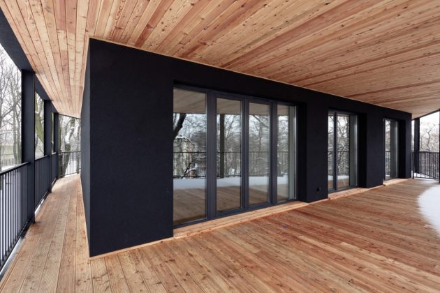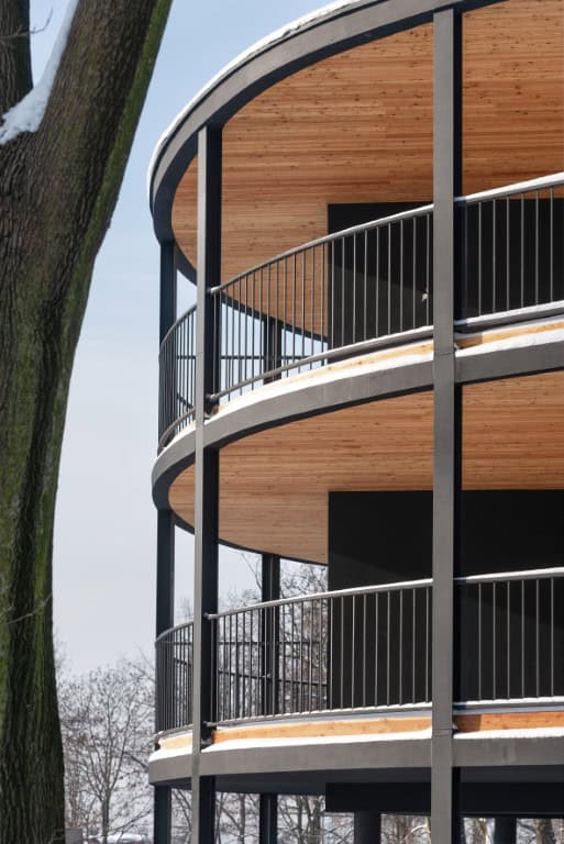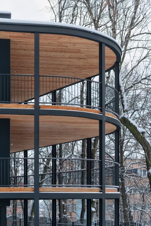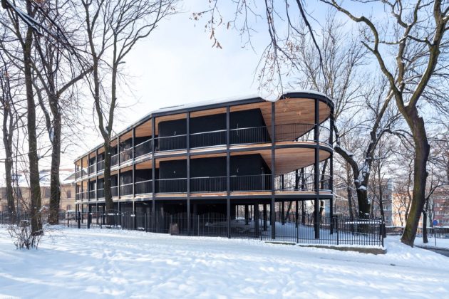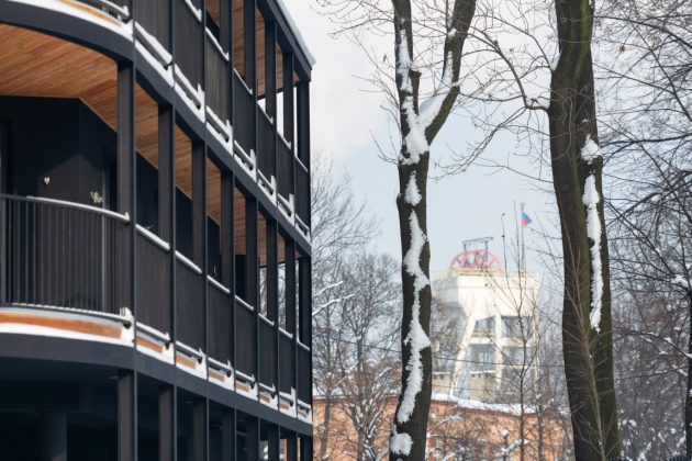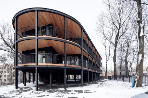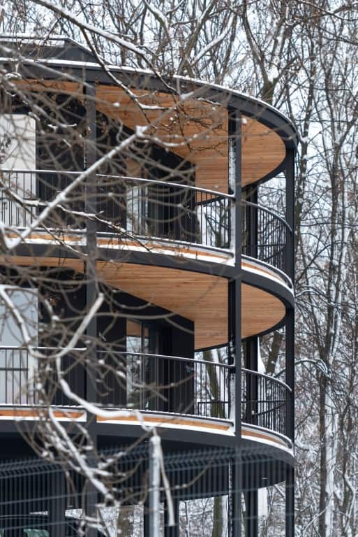 Then, a perimeter line was marked along the plot boundaries and the block of flats was surrounded with balconies to obtain a panoramic opening to the surroundings. Due to the acute angles (foreign in the context), it was decided to round the corners, referring to the character of the interwar villas in the neighborhood, tree crowns, and the surrounding greenery. In the next step, to open the view to the surroundings, the block was dressed in wooden viewing terraces with various surfaces around it, an internal break in the form was introduced by implementing a patio to illuminate the internal parts of the apartments (bathrooms and entrance areas to the apartments) and the floor of the residential part was raised by one level, leaving the undeveloped ground floor as a space for social interactions of residents and additional external functions.