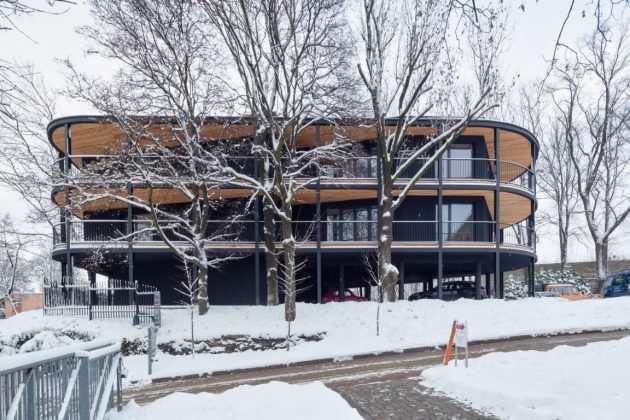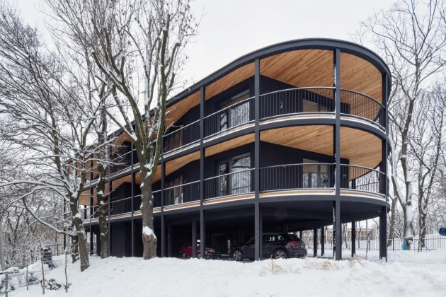 Despite the fact that it looks like one coherent apartment building, it was designed as a complex of four single-family, two-apartment group buildings. The building has been divided into four independently functioning parts, in which there are a total of eight apartments and the ground floor of the building is mostly empty space serving as a common part of all residents and the zone of entrances to the buildings with technical rooms (heat exchanger, power connection, water meter). Each part has an independent entrance on the ground floor in the form of a staircase leading to two premises.