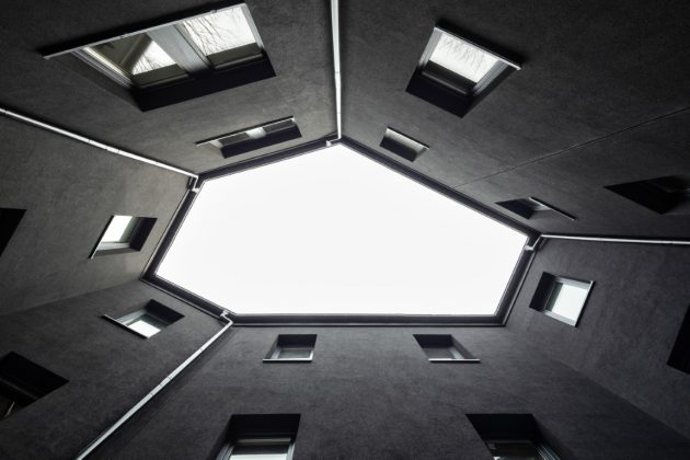 The idea and shape of the building resulted directly from the irregular polygonal shape of the area intended for development and the idea of ​​leaving the largest possible tree stand on the plot. Such a simple inspiration has become the basic guideline for shaping the building. Creating the form step by step, first of all: the solid was formed in accordance with the function of the apartments, optimizing their function into the shape of an irregular polygon.