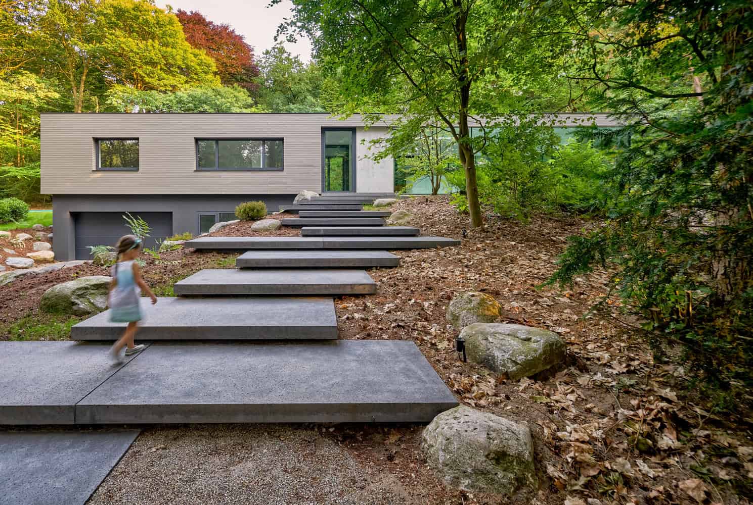 During the metamorphosis, Reitsema and Weitering took full advantage of Villa RR’s hilltop position. The house comprises two storeys on the east side and one on the west. The application of dark stucco to the lower floor, which contains a double garage and a home office, turned it into a sort of plinth for the floor above, where the living and sleeping areas are located. The upper storey is given a distinctive appearance by a new wooden facade, which is relatively closed on the east side and fully open on the west. The front door marks the transition between the two sections. A playful outdoor staircase gives the entrance extra appeal.