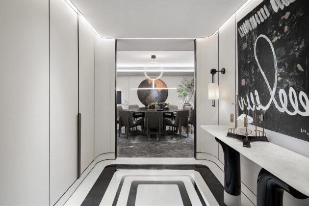 In the master bedroom, the design advocates a sense of scale. Here, the rhythm and charm conveyed by the screen-like elements are felt in graceful continuation. The stylish and practical walk-in closet occupies 35% out of the space. Moreover, the planning and design of all services in the space are rooted in the spiritual needs of users, tincturing it with aesthetic elements and an artistic environment full of lively and cultural attributes.