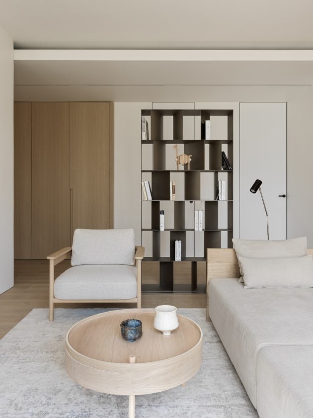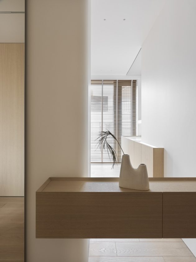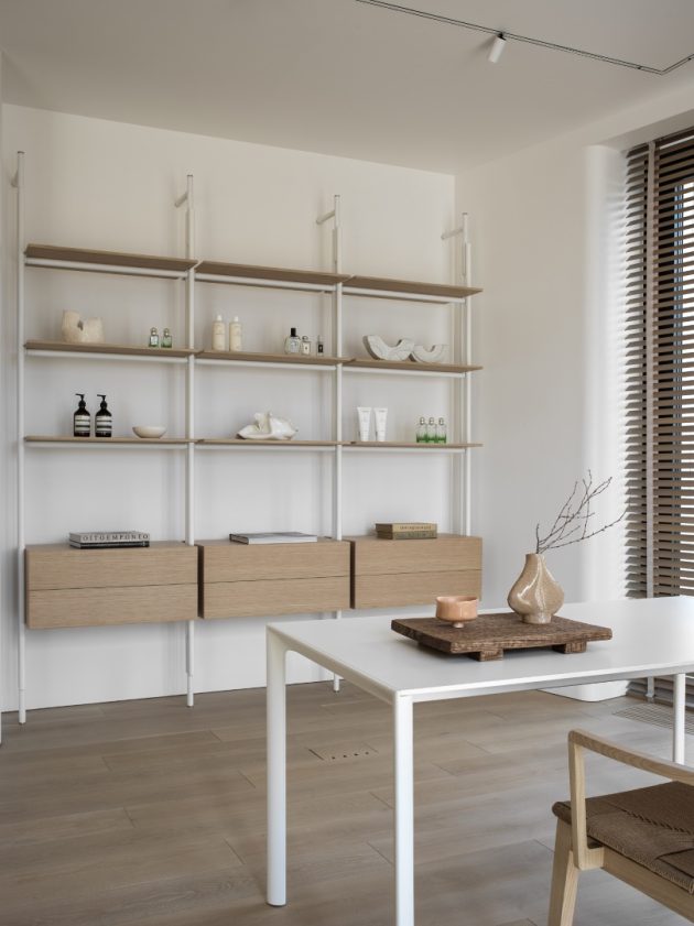 At the entrance, a levitating wooden cabinet suspended between two walls sets the tone. Functionally, it allows light to pass through the hallway; visually, it piques curiosity, encouraging exploration deeper into the apartment.