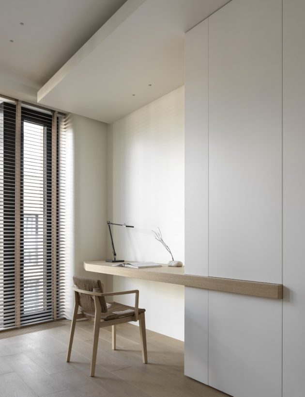 On the central axis, a round dining table with chairs and a pendant lamp defines the dining area. The furniture choices are intentionally laconic, Japanese-like in style, reinforcing the theme of simplicity and balance.