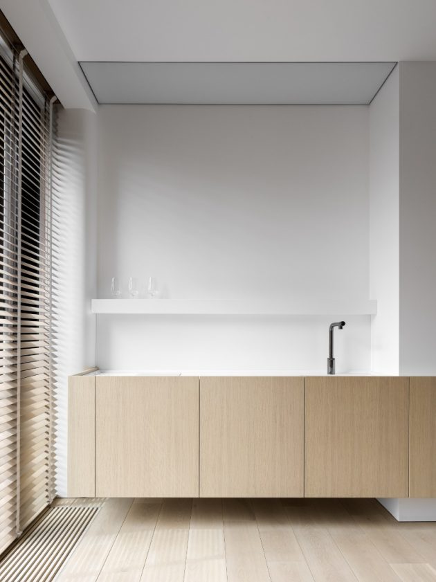 Since the clients rarely cook, the kitchen was designed as a minimalist, compact ribbon of wood that appears almost sculptural. Only the faucets reveal its true function, while all appliances are discreetly built into two vertical columns.