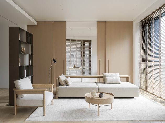One of the most striking features is the large wooden sliding partitions that separate the living room from the studio. These flexible dividers can: