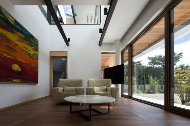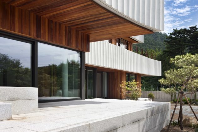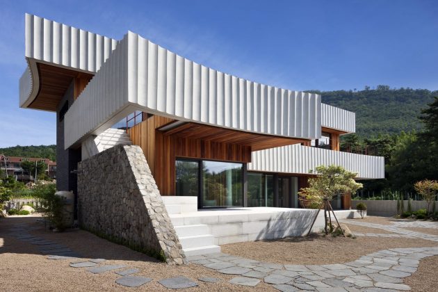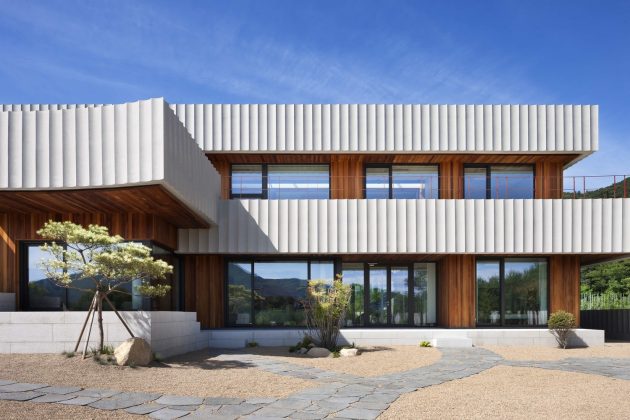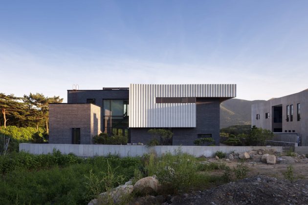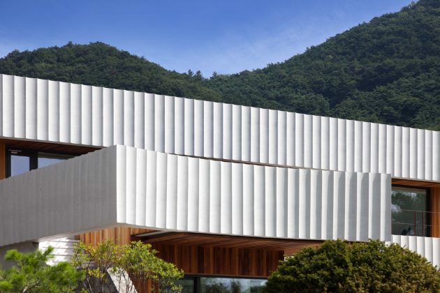 It was designed by the South Korean studio ODE Architects in a way that it is surrounded by thick bands of fluted concrete that create a dramatic play of light and shadow. Furthermore, this 3,207 square foot residence spans across two stories and it is designed to respond to its environment between the city on one side and the mountains on the other.