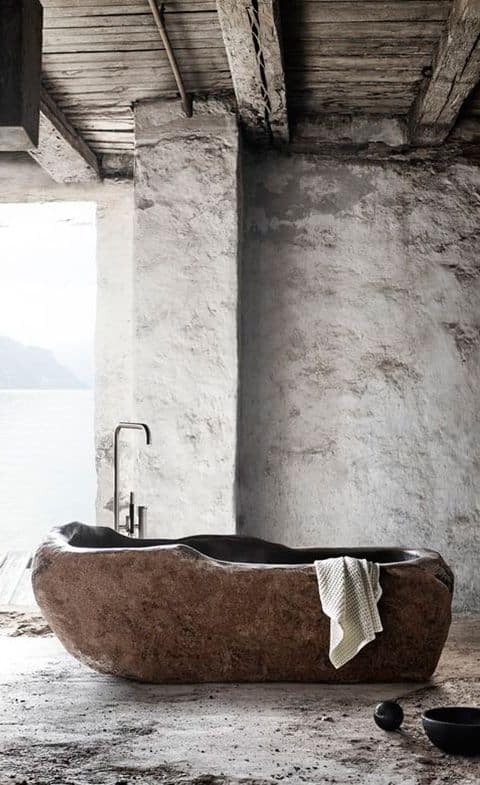 We have already commented previously that the walls in the wabi-sabi code tend towards white but if we choose to go a little further in the consecration of this style, we can also try to leave some wall exposed, because here showing the seams is a virtue, not a flaw. We also like the bathtub a lot, but perhaps it is a little less practical.