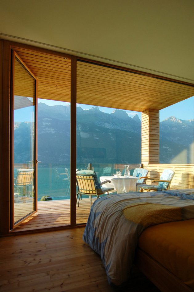 The architecture of the Walensee House is a modern take on the rustic look, blending it perfectly with the natural landscape.