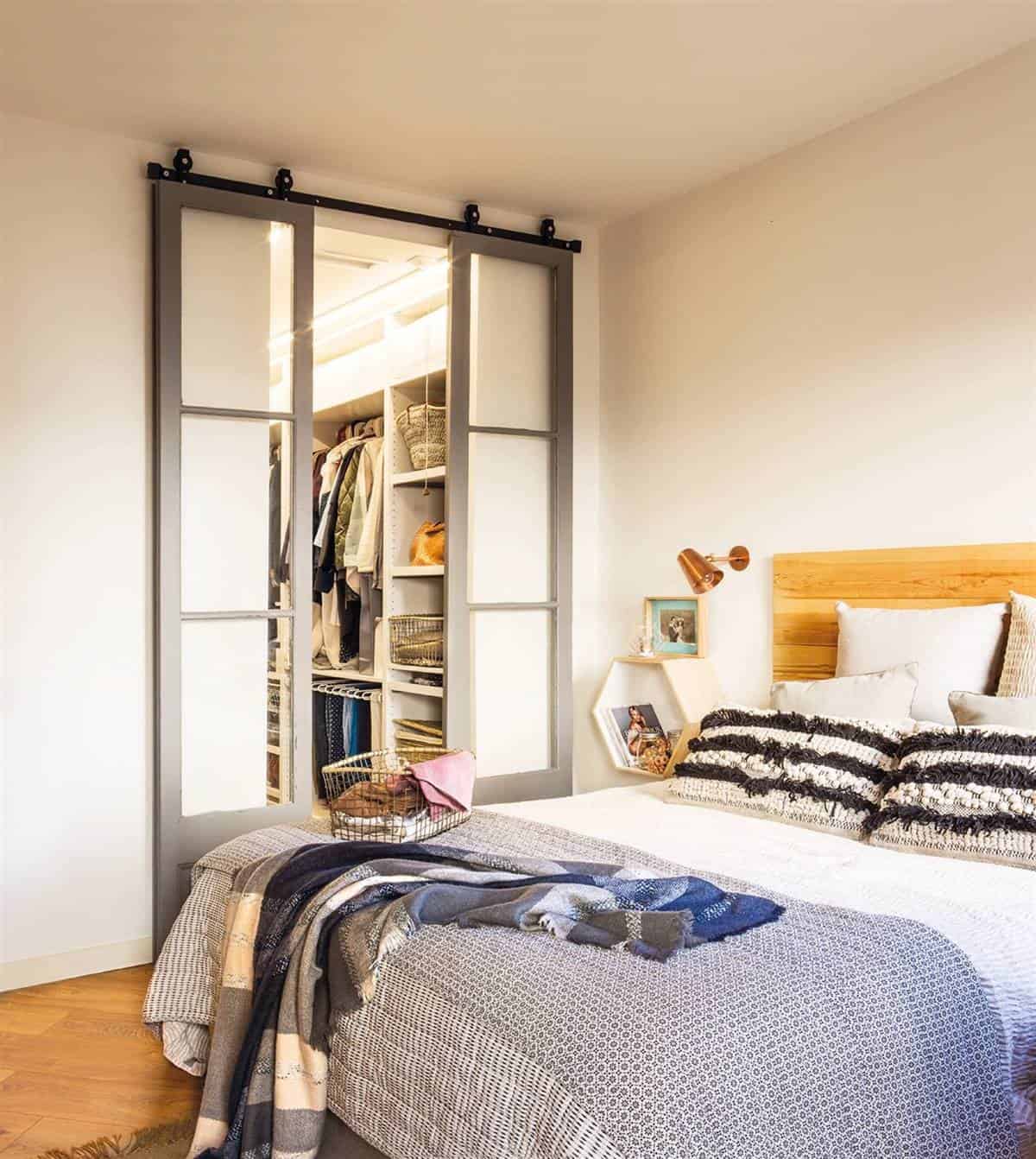 Visible slides, like the one in this dressing room, are a very practical option if you don’t want to get into others. And if you are a handyman you can even install them yourself, since they run through some visible guides. The only “but” is that you need to free the sides of the wall so that the door can move. These doors have the plus of being two recovered wings converted into a sliding door.