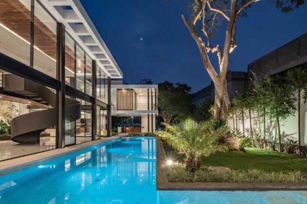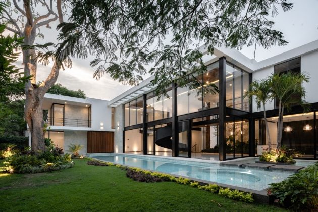 The residence emerges from a U-shaped floor plan, oriented to protect privacy while framing a central courtyard dominated by a radiant swimming pool. This geometry is both functional and poetic—shielding the home from the intense tropical sun while capturing cross-breezes, reflections, and lush views from every room.