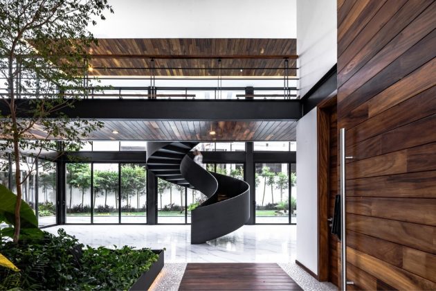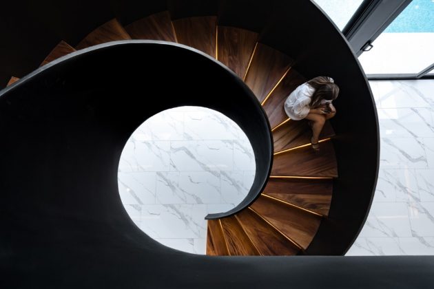 • Steel and glass: used in structural elements and the striking black spiral staircase, which doubles as a sculptural centerpiece.