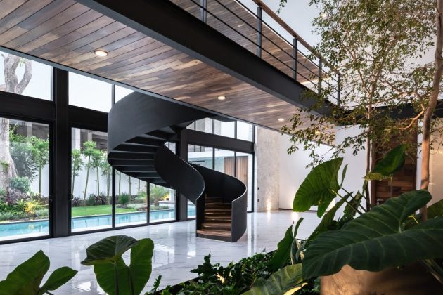 • Double-height glazing floods the interiors with natural light while maintaining uninterrupted sightlines toward the courtyard.