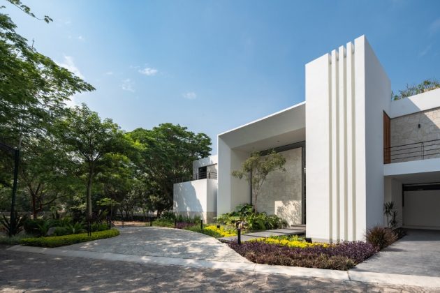 At the heart of the home stands a Primavera tree, its yellow blossoms mirrored in the pool’s blue expanse. Around it, the architecture unfolds in soft rhythms of openness and shelter, connecting interiors with terraces, gardens, and shaded walkways.