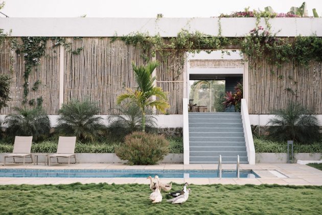 Surrounded by lush greens, bamboo screens and white textured walls, this courtyard houses the water body, landscape with varied plant species and a floating concrete staircase that leads to terrace. This further bifurcates private and semi-private areas, which connects to a series of sitting spaces, an open kitchen, a dining, and bedrooms with built-in furniture. Few steps down, and one is amazed to see the beautiful view of the lake with a calm pool and local landscape allowing the house to sit quietly within its context.