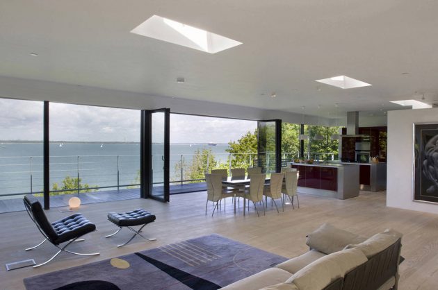 The upper floor houses the main living areas, oriented to maximize panoramic views of the Solent and the surrounding woodland canopy. The open-plan design connects kitchen, dining, and lounge spaces into a single flowing volume.