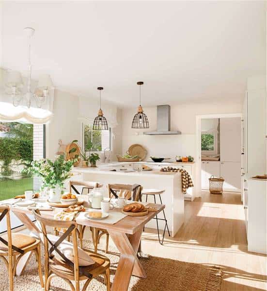 Planned in a U-shaped layout and free of tall cabinets, this minimalist white kitchen feels open and uncluttered. The natural wood tones of the flooring and pendant lighting add warmth and texture to an otherwise monochromatic space. It’s a perfect example of how a white kitchen can feel both serene and inviting when paired with natural elements.
