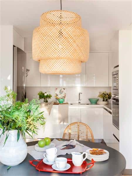 Minimalist white kitchen with light wood tones and woven accents