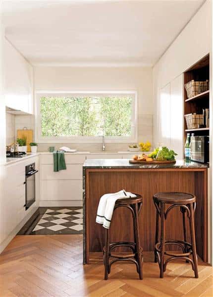 Modern small white kitchen with walnut wood accents and checkerboard floor
