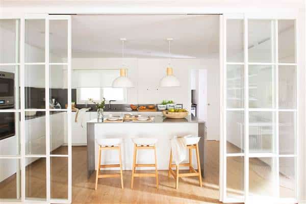 This white kitchen design uses sliding glass doors with white decorative panels to maintain an open flow while subtly separating the cooking area. Glass pendant lighting and open shelving contribute to a light and airy feel.