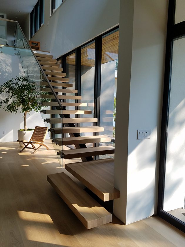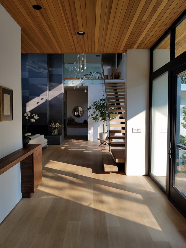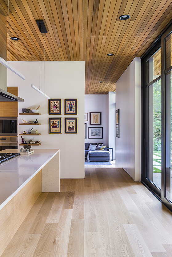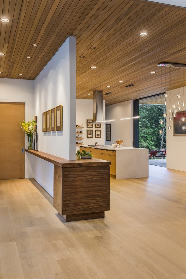Wildwood is comprised of a long, single-loaded, open plan running north-south with living areas oriented west to the 35-acre forest reserve and open space. A two-story central hearth marks the divide between the large living room and the private master suite at the north.  A quiet study at the south acts as a separate retreat from the larger living area with select views to the forest.