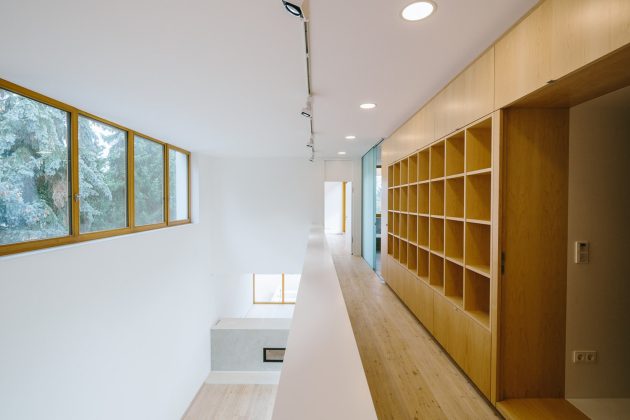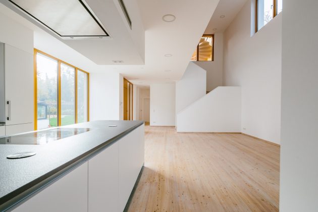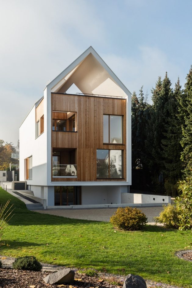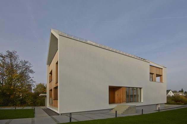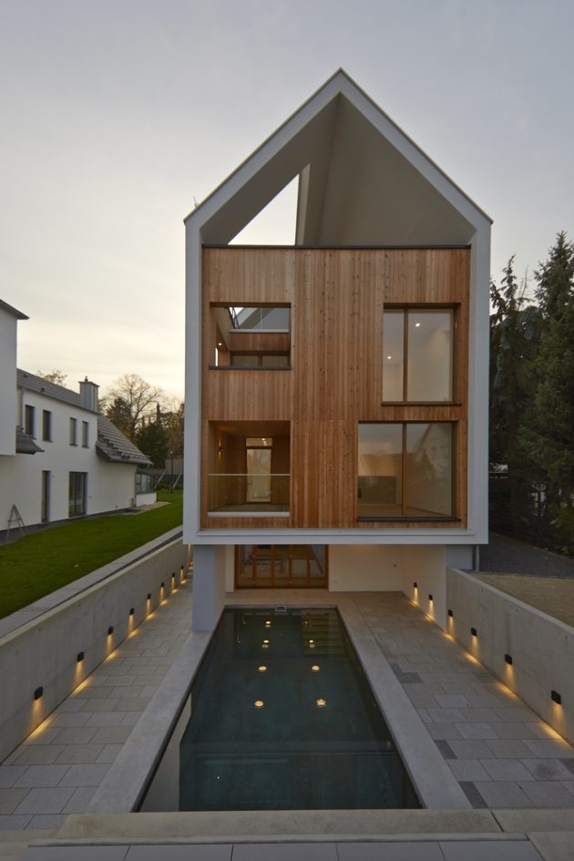 The Wohnhaus am Hainerweg is a modern residence located in Germany designed by JOP Architekten. The architects took inspiration from the surrounding residential buildings with sloped roofs and created a slim building with a gable facing the street. The result is a simple, archetypical house that blends into the neighborhood while still standing out.