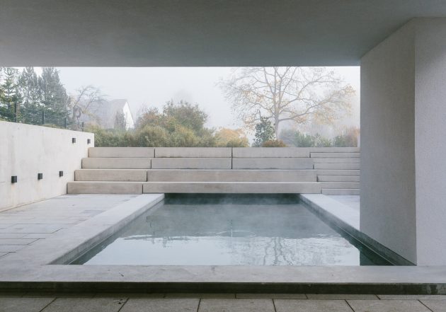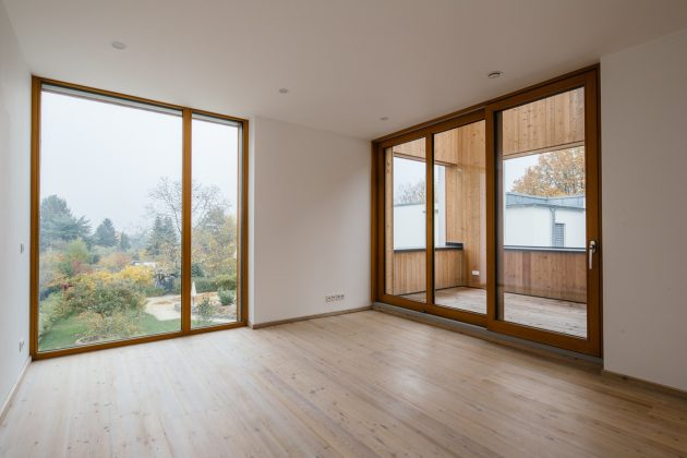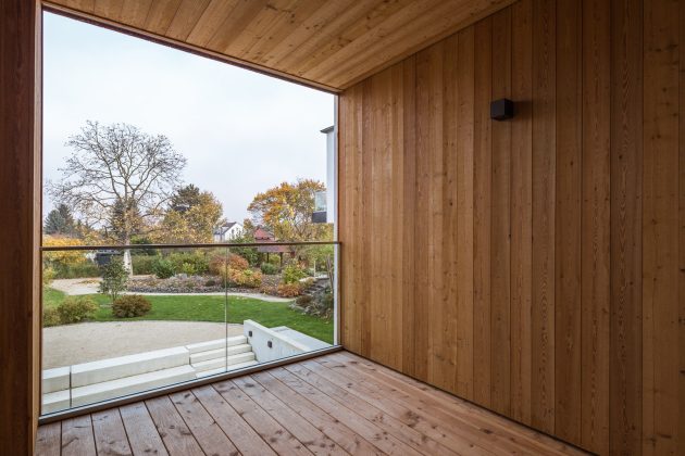 The inner and the outer house differ in color and materiality. Both are constructed as timber structure sitting on a solid base of concrete. Change of construction and material is comprehensible anywhere,  externally and internally and was also adopted in the design of the surrounding garden. The separation of the base by the springback of the lower floor gives the building the look of levitating above ground.