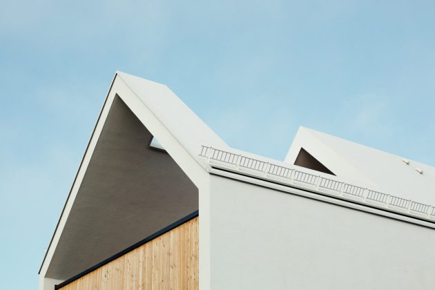 The plot is characterized by the surrounding residential buildings with sloped roofs, and the available narrow site. This leads to the idea to design a slim building with the gable facing to the street. The building appears in a simple form of an archetypical house.