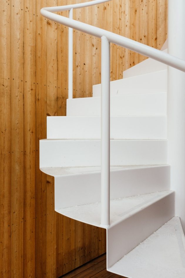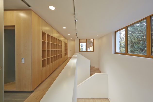 The building’s open-plan layout and multiple terraces and loggias offer a variety of spaces for the residents to enjoy. The fusion of the inner and outer houses creates various types of spaces, ranging from complex to simple rooms. The timber structure sits on a solid concrete base and is distinguished by different colors and materiality for the inner and outer houses.