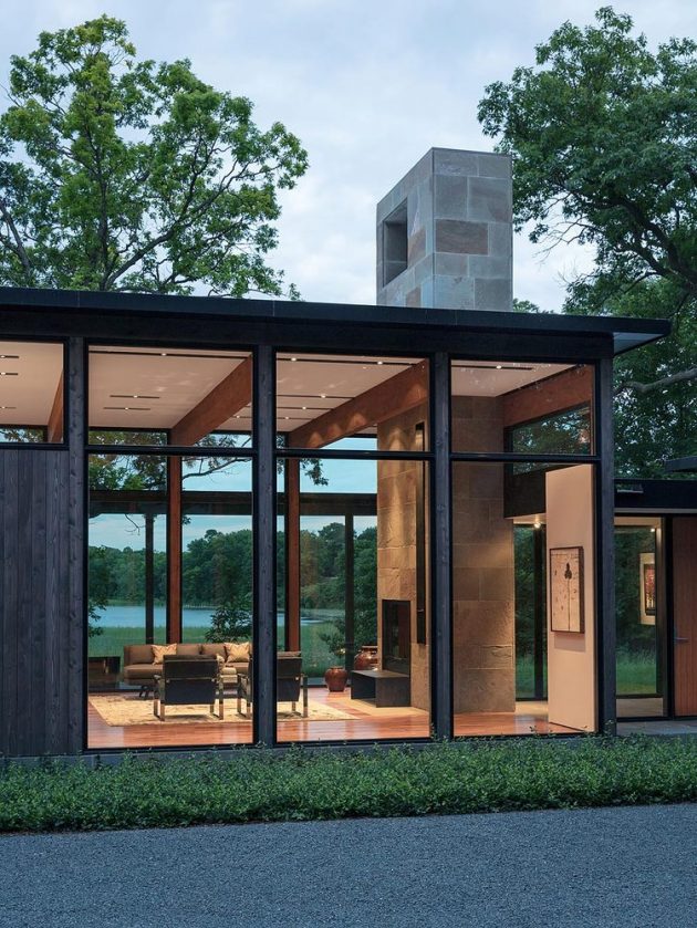 The Woodland House by ALTUS Architecture is a mid-century modern residence located in Woodland, Minnesota. Its wooded plateau overlooks Lake Minnetonka offering dramatic views to the residents. The single level residence has a strong connection to its natural surroundings thanks to the large glazed surfaces that are also responsible for the outward views and the natural light that lights up the entire interior.