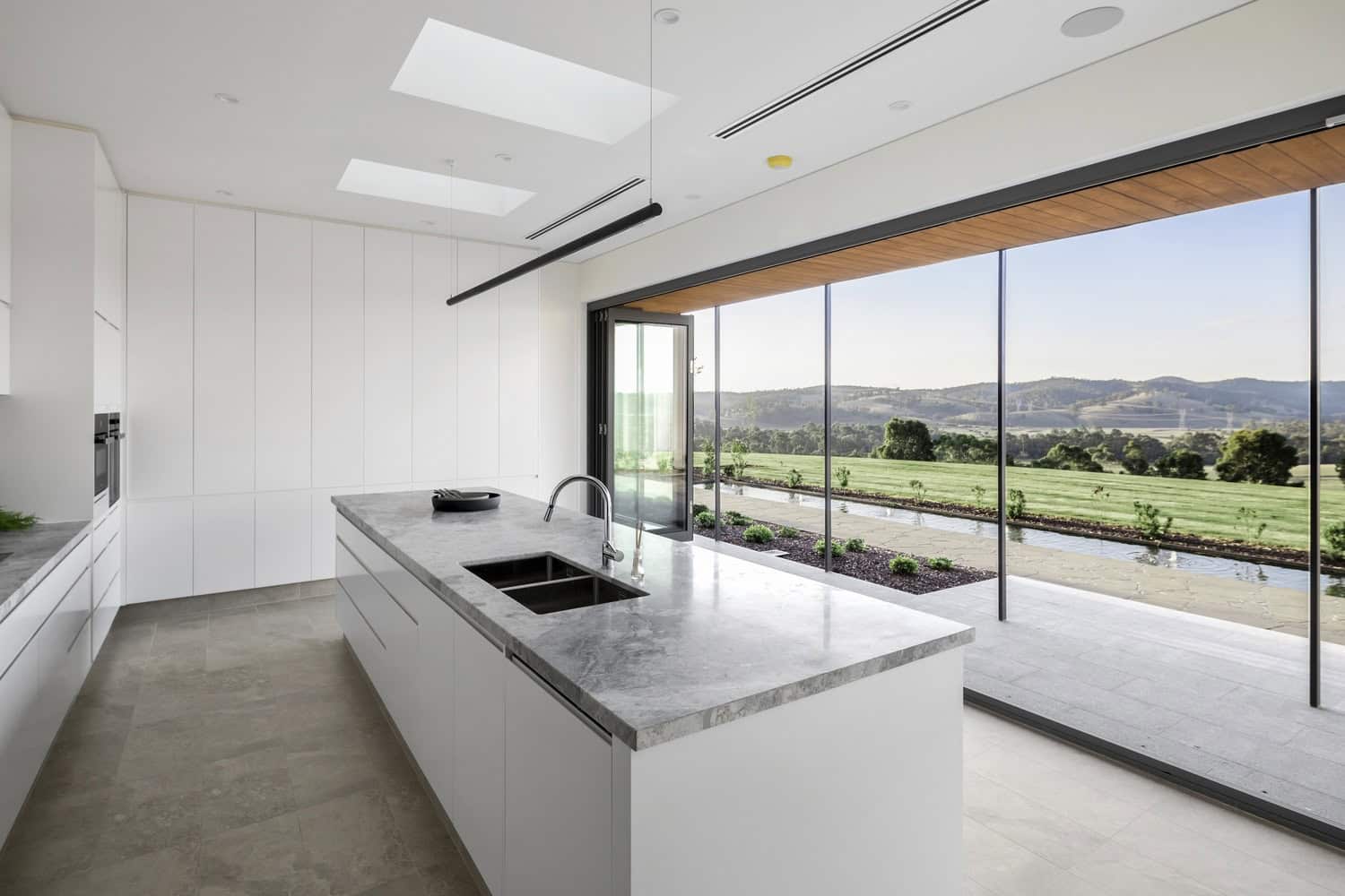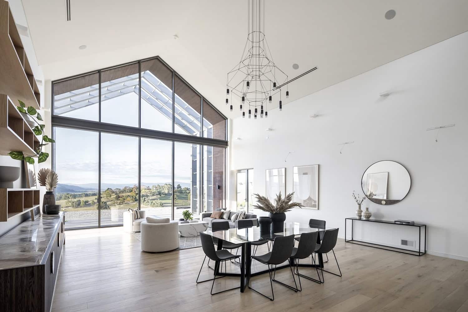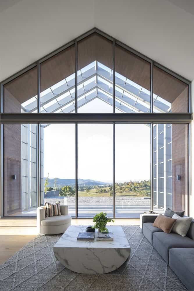 A central light-filled living pavilion acts as the heart of the home, framed by a striking cathedral ceiling that recalls the spirit of traditional barns. Expansive glazing along the northern façade floods the interiors with natural light, while framing the rolling hills beyond.