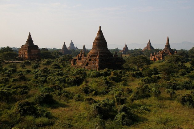 Bagan, also spelled Pagan, on the banks of the Ayerwaddy River, is home to the largest area of Buddhist temples, pagodas, stupas and ruins in the world. It was the capital of several ancient kings of Burma who built perhaps as many as 4,400 temples during the height of the kingdom (between 1000 and 1200 AD). In 1287, the kingdom fell to the Mongols, after refusing to pay tribute to Kublai Khan and Bagan quickly declined as a political center, but continued to flourish as a place of Buddhist scholarship.
