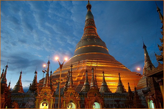 The Shwedagon Pagoda (or Golden Pagoda) in Yangon, is the holiest Buddhist shrine in Burma. The origins of Shwedagon are lost in antiquity but it is estimated that the Pagoda was first built by the Mon during the Bagan period, sometime between the 6th and 10th century AD. The temple complex is full of glittering, colorful stupas but the center of attention is the 99 meter high (326 feet) high main stupa that is completely covered in gold.