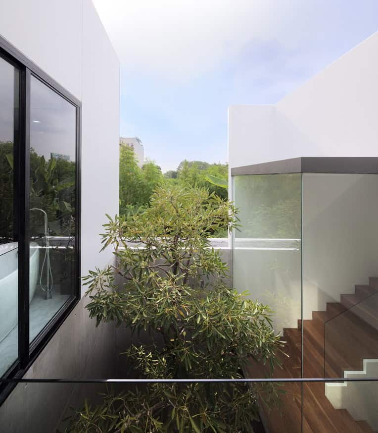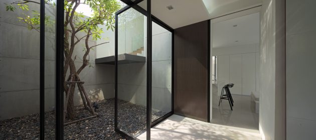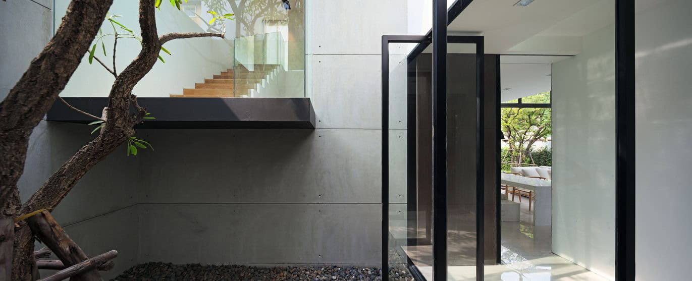 The ground floor is arranged as a Thai traditional house design with a central courtyard that functions as a feature foyer and distributor before accessing to the main living space. A staircase enclosed in a glass box is floating over this underlying front garden as a main feature for the entrance.
