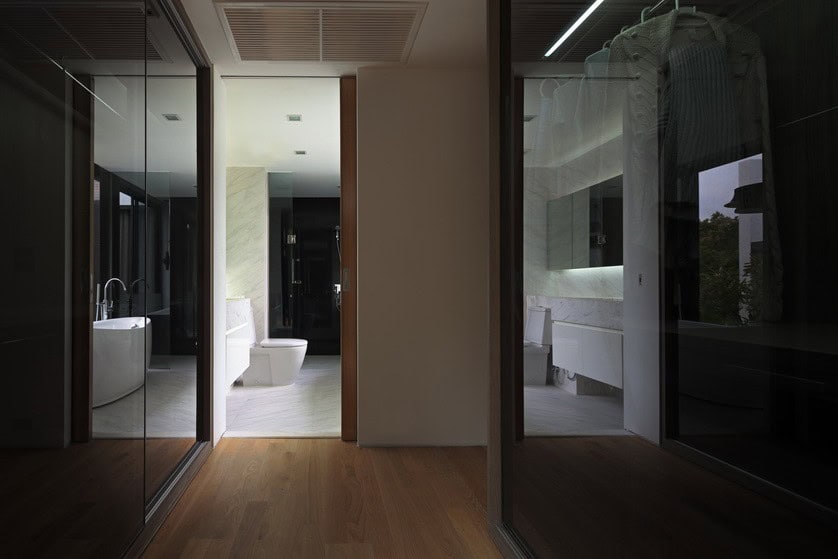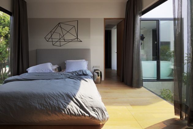 The other two bedrooms are located on another side of the house by extending on top of the swimming pool on a cantilevered concrete slab enclosed by a big glass wall with black aluminum cladding.