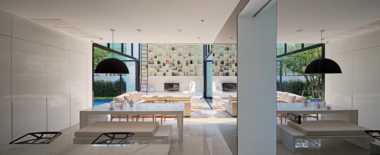 The main living space is located in the center as the floating pavilion where the family can enjoy the outdoor garden and swimming pool. The living space directly connects to the terrace, the garden and the swimming pool with double -height folding windows that facilitate the fusion of spaces. The approach of situating a swimming pool in the back of the house produces a space that is diverse and suitable to various activities.