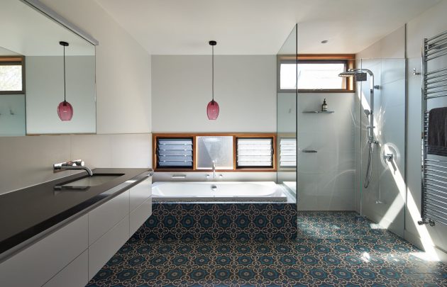 Most importantly, it’s a house designed to enjoy the outdoors while indoors through natural light, ventilation and connections to garden and sky. As you walk through the house, the deciduous trees and vines used for summer shading also provide anticipation of the seasons as their color and foliage change. Reclining in the living room watching the light through the red leaves of the ornamental grape vine on the wire trellis in autumn, sitting at the dining table appreciating the color in the native bushes in winter when the leaves on the exotic trees have long gone, washing the dishes looking out at the courtyard tree as it blooms in spring and flopping on the wrap-around couches in the sunken lounge on a hot summers day whilst enjoying the cool breeze coming from the pond and shady microclimate of the courtyard are just some of the moments that will delight the family for many years to come.