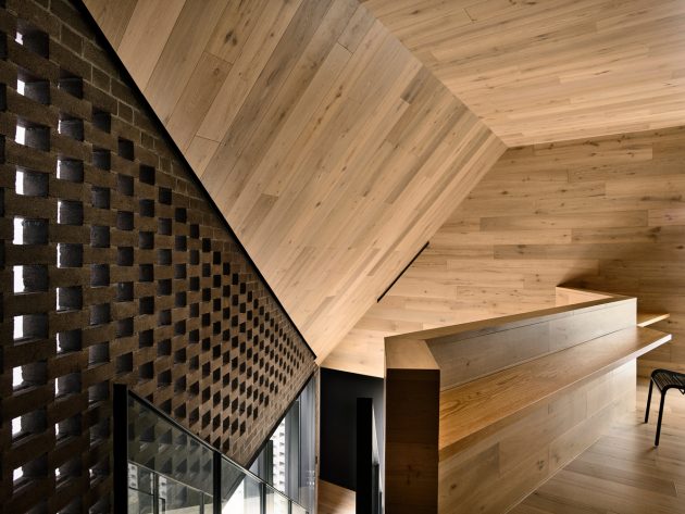 The form responds to the hips and gables of the prevalent existing heritage buildings. A central focus is a sculptural staircase, which delivers its occupants from the ground floor to a landing study nook, set under a folding origami, timber-lined ceiling. The downstairs living spaces, while all being open plan, are delineated by a series of levels. These levels choreograph an engaging journey through the various components of the space (living, kitchen, dining, study), imagining each as its own individual space, yet linked through a palette of textured materials and clever sightlines that provide striking vistas, taking in the depth of the site and its multiple facets.