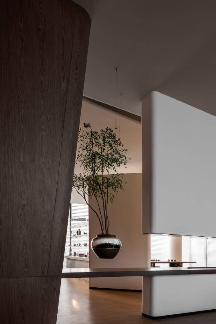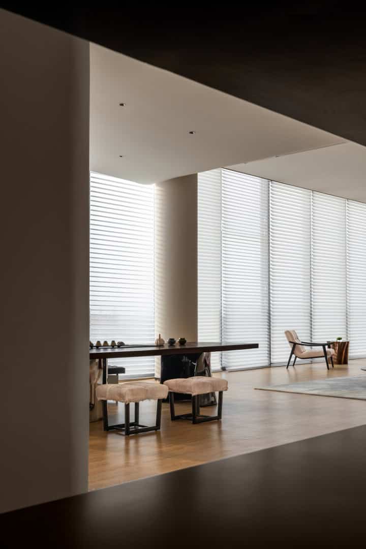 Once interconnected, each independent space has a clear function, with circulation paths linking different functional modules, expanding into multiple composite spaces. They overlap and are used together. The office area, lounge area, and tea area make up a narrow space group along the windows. The Western dining area, Chinese dining area, and lounge area are situated on the northern side in opposition. North and south spatial groups are interconnected through intersecting walls, sliding doors, low TV walls, and electronic fireplaces, facilitating an internal network of multi-use, and versatile space organization.