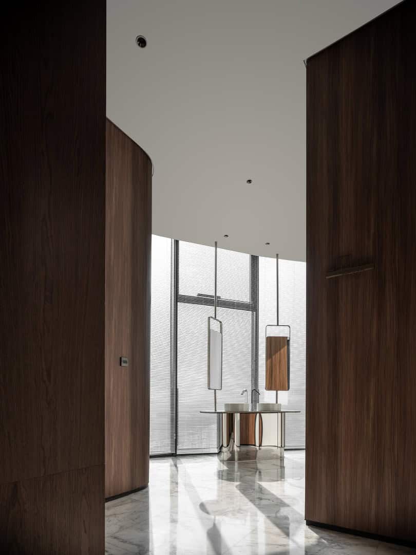 The material palette and lighting strategy at Yuecheng·Yanyuan embody a refined sense of artful restraint. Curved internal walls soften the space, while controlled tilts and subtle rotations introduce movement and rhythm. Natural light floods in through south-facing full-height glazing, animating the interiors with shifting patterns of light and shadow throughout the day.