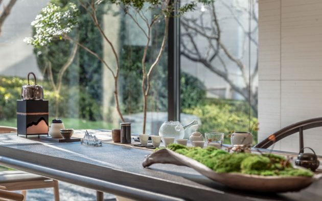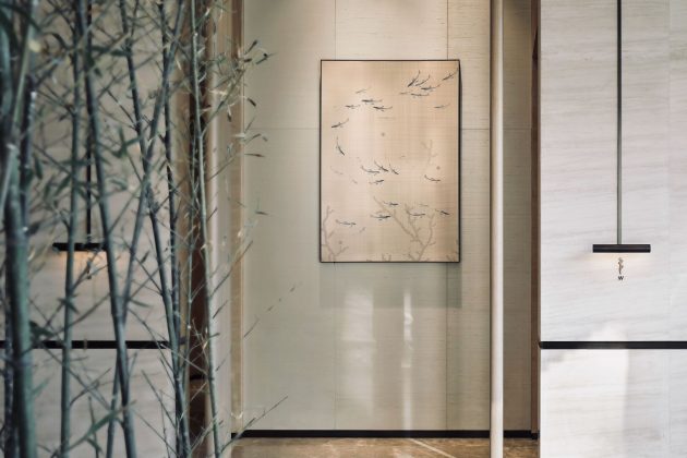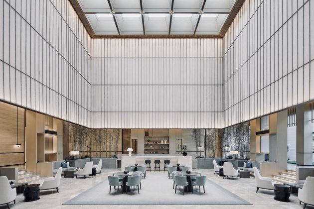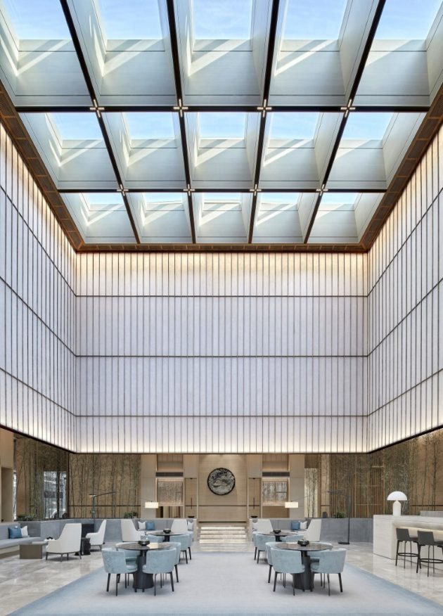 The orderly patio attracts all visitors to look up at the blue sky. Narrow on the top and wide on the bottom, its spatial structure provides better lighting for the space here. The atrium is surrounded with bamboo screens on the floor.