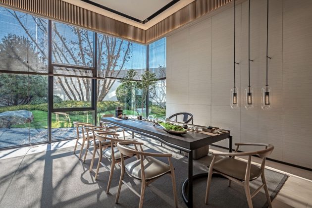 With an overall warm tone, the interior design maintains typical Chinese simple style. Those folding glass doors allow the indoor and outdoor scenery to integrate directly.