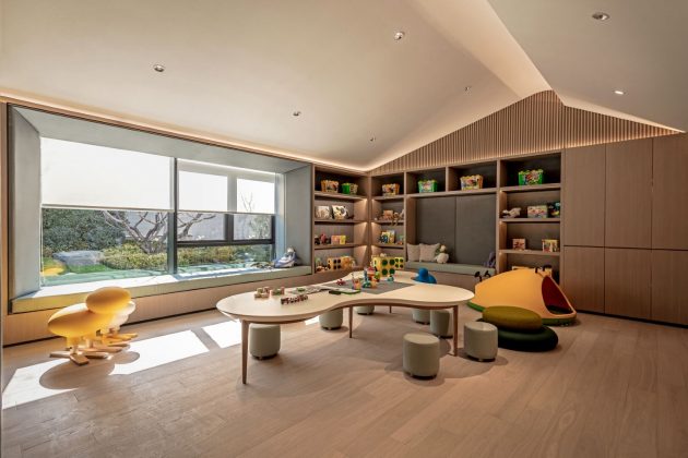The natural texture of the wood strips extends from the patio facing till the corridor. A teahouse, a MINI playground for children, a projector room, a music room, a shared office area and a sunken rest area have been waiting for their guests.