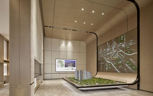 The sand table area is decorated with simple arc boards with wood veneer, and the ceilings are also made of real wood veneer combined with metal plate, which can link with and transit to the wood veneer of the walls naturally and excessively, to express a pure oriental image.