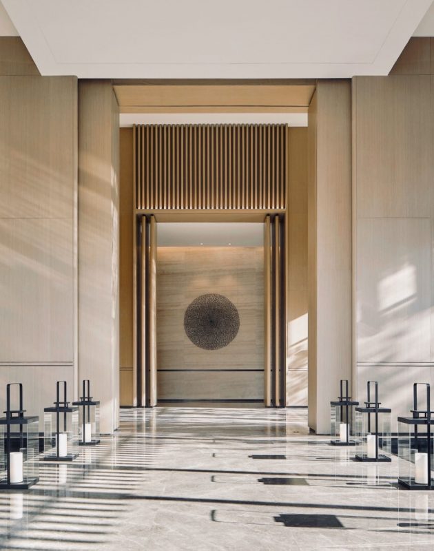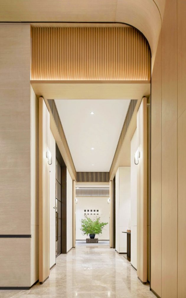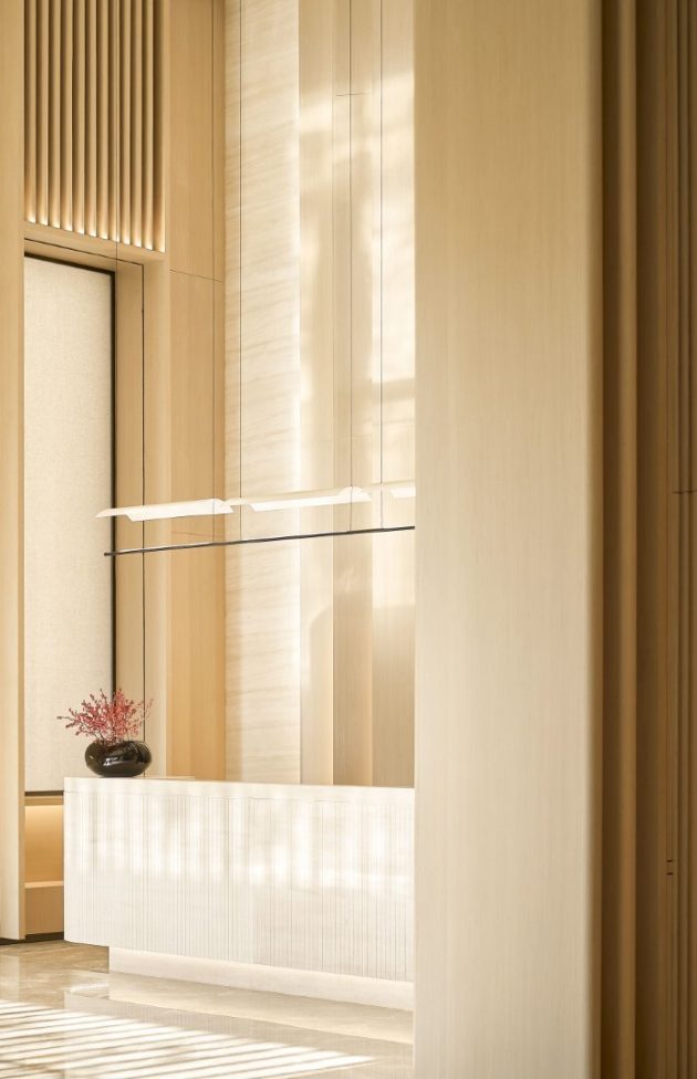In the reception hall, the two-way door and the vertical arc-edge slabs on both sides form a layered background. Facing the outdoor landscape and green plants, these spatial layers form a visual connection between the near water and the distant scenery.