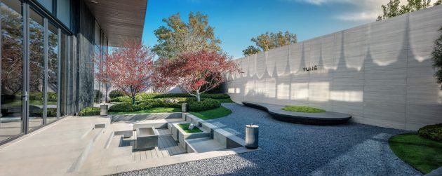 The gate is connected to a series of visual elements, such as point, line and plane, with folding planes at oblique angles. The background wall at the entrance to YUNĒ highlights artworks. There are the landscape pools with slowly flowing water inside on both sides of the corridor.