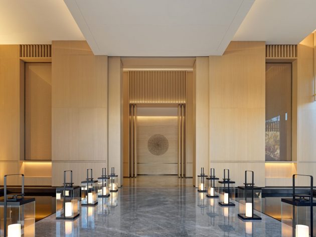 With natural oak wood and natural gauze curtains made of silk, a glass screen stands high with gauze inside, guiding guests to step inside in an orderly manner. These symmetrical layered elements and the low-to-high hall restore the pure humanistic life in combination with downy tone and light.
