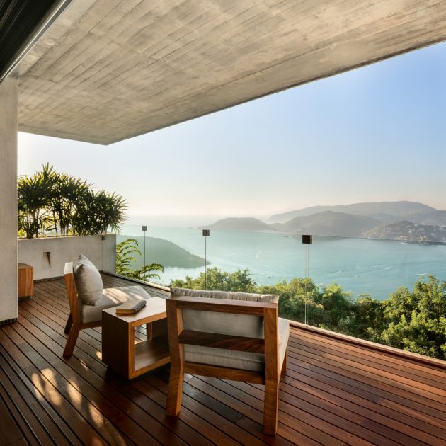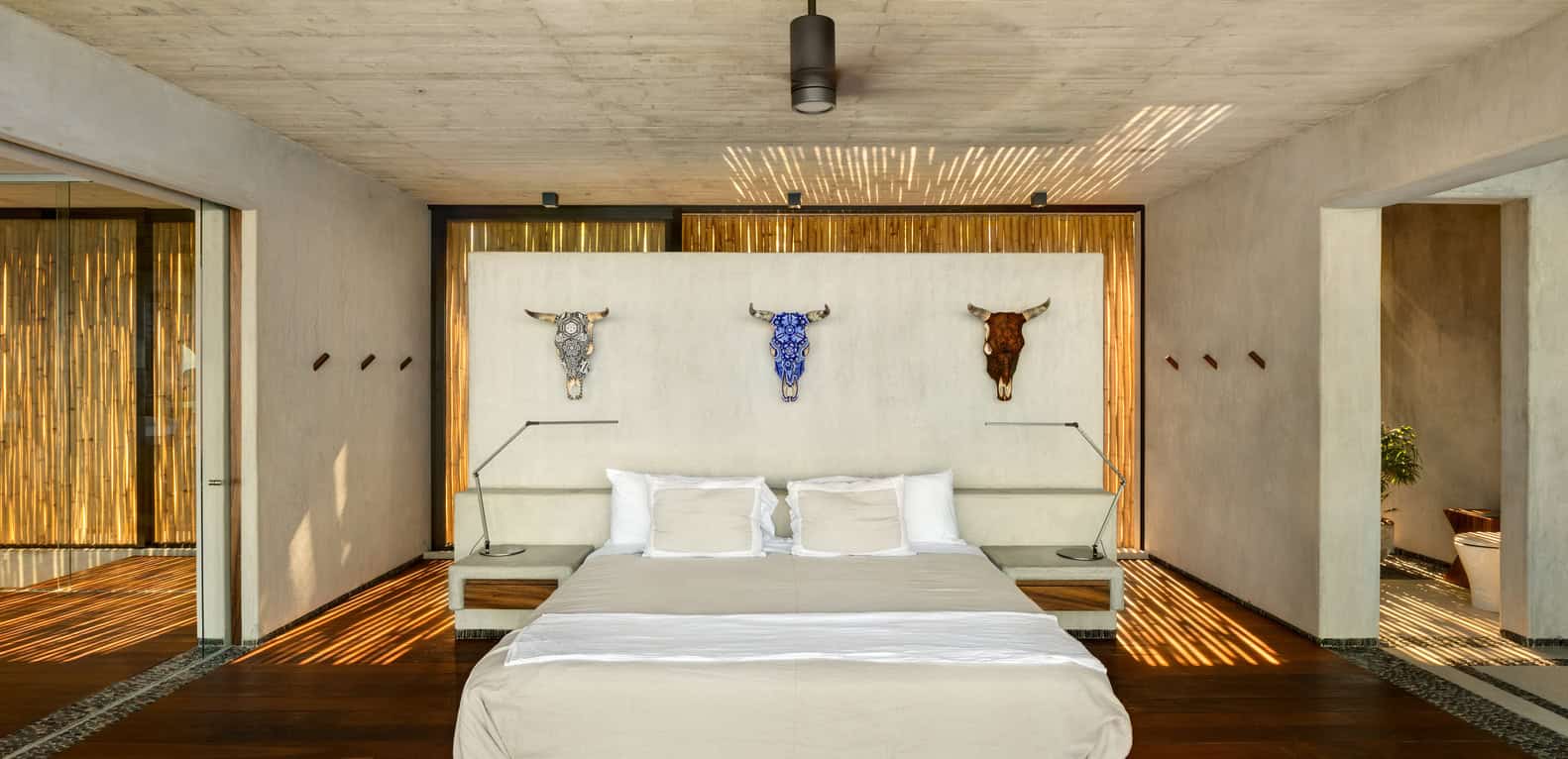 Private wing: Bedrooms step downward with the terrain, each with a private terrace, outdoor shower, and framed sea view. Sliding timber screens control glare and privacy without blocking air.