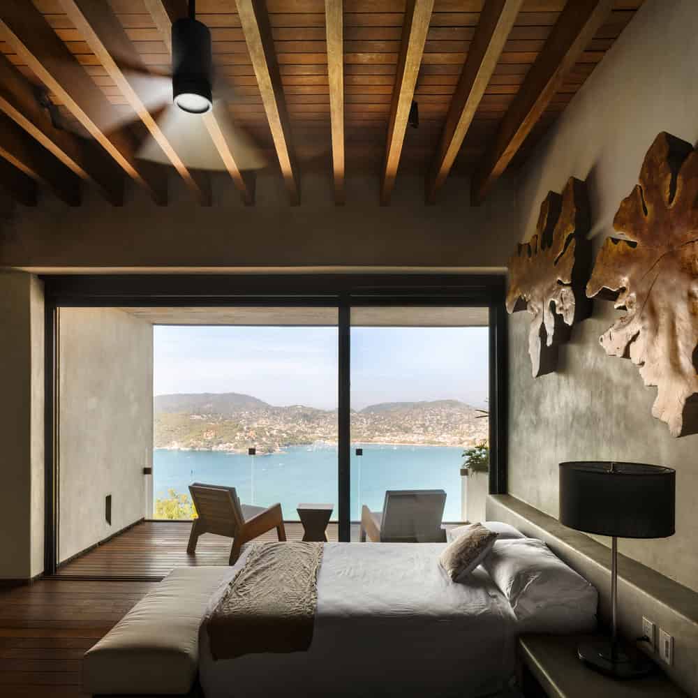 Timber: Parota for ceilings, doors, and built-ins; treated for salt air, oiled rather than varnished so pieces can be renewed without full refinishing.