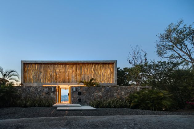Openings. Marine-grade hardware and parota (a dense, stable hardwood) are used for sliding panels and pivot doors. Insect screens and wood lattice panels introduce a second breathable layer, enabling the house to stay open at night without inviting pests.